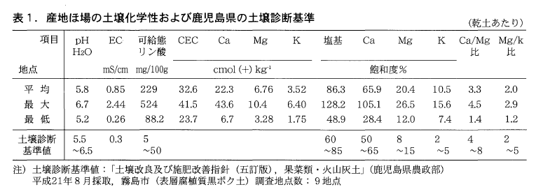 一方,本県におけるニガウリ栽培ほ場の地力実態をみると,土壌化学性のうち土壌pHは県土壌診断基準の適正範囲内であるが,可給態リン酸,交換性カリは県診断基準値を明らかに上回っている(表1)。このことは,施設ニガウリ産地において投入養分量と養分吸収量のアンバランスが生じていることを示している。特に問題とされるのは,交換性カリ,可給態リン酸の集積がみられるほ場において,養分収支を考慮しない有機物,化学肥料を連用していくと,塩類集積がますます進行するだけでなく,これに伴う生育不良の発生や収量低下および環境負荷の増大が懸念される点である。