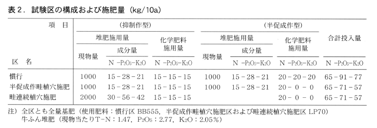 リン酸はいずれの処理区も基肥時に12.4kg/10a施用した。加里はいずれの処理区も総量は同ーとし,リニア140タイプ,シグモイド120タイプにおいては基肥時に16.2kg/10a施用した。
