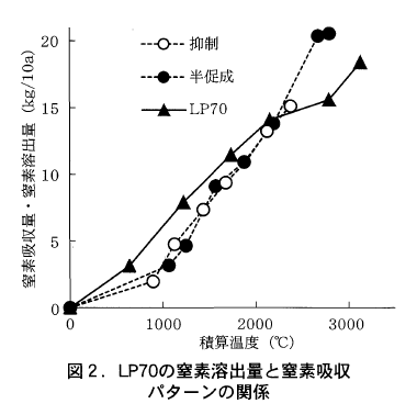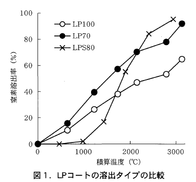 図1にLPコートの溶出タイプの比較,図2にLP70の窒素溶出量と窒素吸収パターンの関係を示す。半促成作型と抑制作型の窒素吸収量は,収量レベルが異なるため最終の窒素吸収量に違いが見られたが,ハウス内気温の積算温度に対する窒素吸収量の推移は2の作型でかなりよく一致することが認められた。さらに,ニガウリ栽培は施設でも無加温栽培が多いため積算温度から窒素吸収パターンを推測できると考えられた。