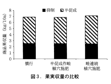 図3に果実収量の比較を示す。抑制作型では,牛ふん堆肥施用量の違いが生育および収量に及ぼす影響はみられなかった。半促成作型における半促成作畦植穴施肥区および畦連続植穴施肥区の果実収量はいずれも同等であった。施肥および定植作業に要する作業時間を調査した結果,畦連続植穴施肥区の作業時間は堆肥および、肥料散布,耕転の作業時間を省略できるため,慣行施肥の2割程度となり大幅な省力化が図られることが明らかになった。