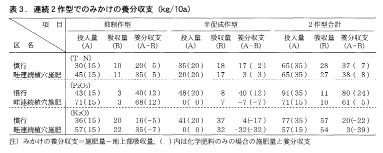2作合計の窒素収支をみると,堆肥+化学肥料では37~38kg/10a,化学肥料のみでは7~8kg/10aとなった。リン酸についてみると2作型合計の吸収量が10~11kg/10aと窒素やカリに比べ少なく,リン酸収支は61~80kg/10aと多かった。畦連続植穴施肥区はリン酸投入量が少ないため,慣行区に比べリン酸収支は少なくなった。堆肥+化学肥料のカリ収支では,慣行区で20kg/10a,畦連続植穴施肥区で3kg/10aとなり,カリ投入量が少ない畦連続植穴施肥区のカリ収支は慣行区に比べ少なかった。窒素とリン酸は化学肥料のみでプラスの収支となるが,カリ収支は化学肥料だけでは全区ともマイナスとなり,堆肥施用がなければ土壌養分は徐々に消耗していくと考えられた。