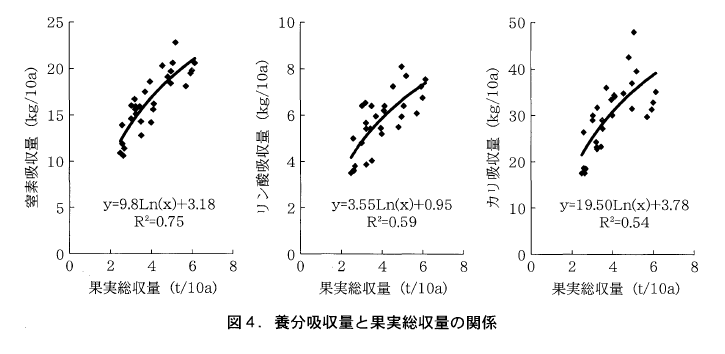 ニガウリには促成,半促成,抑制等の作型があり,収量レベルは大きく異なる。そのために生産地の収量レベルに応じた施肥基準の設定が土壌養分の過剰蓄積回避にとって重要である。図4に養分吸収量と収量の関係を示す。果実総収量と養分吸収量との間には相関関係がある。この関係から目標収量での養分吸収量を推定すると,抑制作型で目標収量3t/10aの場合,窒素が14kg/10a(以下/10a略),リン酸が5kg,カリが25kgである。半促成作型で目標収量6tの場合,窒素が21kg,リン酸が7kg,カリが39kgであり,窒素およびカリ吸収量に比ペリン酸吸収量は少ない。慣行栽培における化学肥料のリン酸施肥量は,半促成作型で目標収量確保のためのリン酸吸収量の3倍近くあり,栽培終了時の残存養分が多い。堆肥からのリン酸投入量まで含めて計算するとさらに残存量が多くなる。カリについては,化学肥料だけでは養分収支がマイナスになるため堆肥を施用しなければ地力を消耗することになる。牛ふん堆肥のみでカリ吸収相当量を施用すると仮定した場合の堆肥施用量は,半促成作型で2t/10a程度,抑制作型1~1.5t/10aが必要となると考えられる。