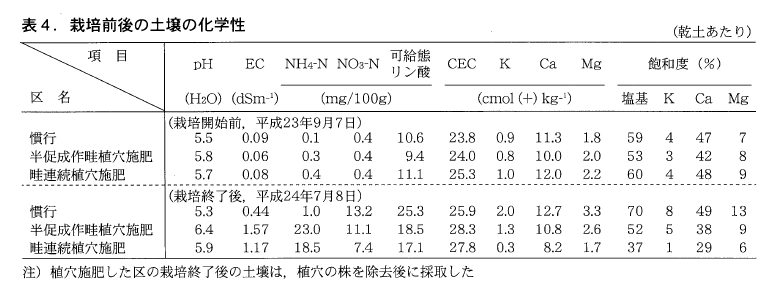 表4に栽培前後の土壌化学性を示す。栽培開始前に比べ慣行区の交換性カリ含量は増加したが,畦連続植穴施肥区における交換性カリ含量の増加はなかった。可給態リン酸含量は全区とも栽培開始前に比べ増加し,畦連続植穴施肥区の可給態リン酸含量の増加は慣行区に比べ少なかった。栽培終了後における畦連続植穴施肥区の可給態リン酸および交換性カリ含量は,慣行区に比べ低かった。これは,畦連続植穴施肥区が半促成作型においてリン酸およびカリ養分を無施用であったためであると考えられる。