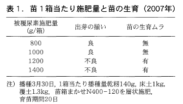 2007年と2008年に育苗箱全量施肥区の育苗日数を標準区より4日程度短縮し苗の生育を検討した。その結果,育苗箱全量施肥区は標準区に比べ苗が徒長しマット形成も不十分であった(表2)。