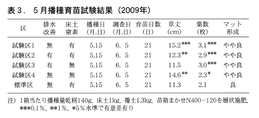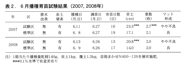 5月播種の育苗試験では排水性の改善と床土窒素の有無を組み合わせて検討した。その結果,マット形成はいずれの試験区も差はなかったが,排水性が良く,無窒素の床土にした試験区で苗長が標準区並となった(表3)。