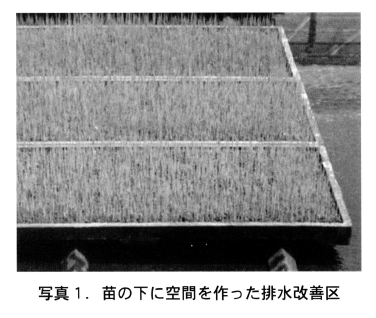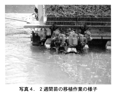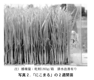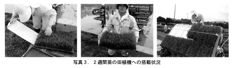 そこで, 2011年に播種量180g,床土量1.7kg,育苗日数13~14日の短期育苗,および排水改善処理により育成した苗(写真2)を6月上旬と6月下旬に本田へ移植し,作業性について評価した。