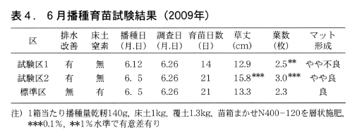 そこで,6月播種では排水改善・無窒素床土に育苗期間を短縮した試験区を設け検討した。その結果,育苗期間を短縮した試験区で標準区並の苗長となったが,苗のマット形成は不十分であり作業性に問題があった(表4)。このため苗マット形成の改善が必要であると考えられた。
