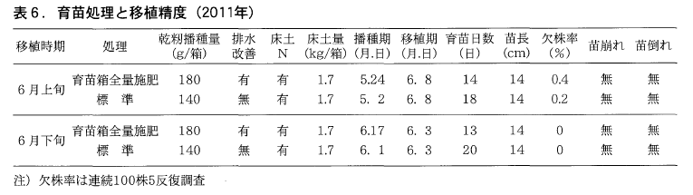 その結果,田植機搭載時の苗崩れや,移植後の苗倒れの発生は無く,欠株率も0.4%程度で,実用上問題の無い苗であると考えられた(写真3,写真4,表6)。