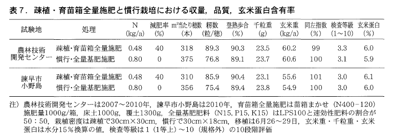 試験の結果,育苗箱全量施肥による疎植栽培区では標準区に比べ㎡当たり穂数は少なかったが,1穂籾数は多く登熟歩合も高く,玄米重は標準区と同等であった。また,検査等級や玄米蛋白含有率も標準区並であった(表7)。