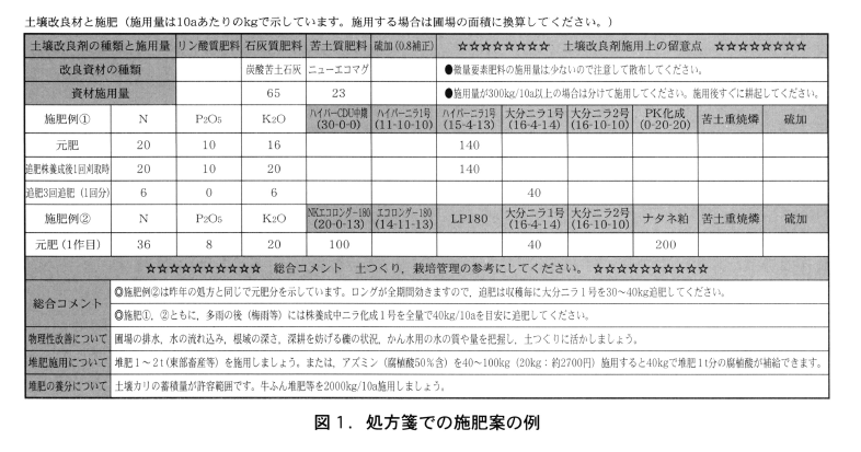 処方築で施肥改善を提案する方法として(図1),慣行の1案と改善案の2案を表記している。2案には1案とは異なる肥料を組合せた施肥を提案しているが,これに挑戦する生産者の反響を見ながら,次の土壌診断の機会には,施肥2案を本命の1案とし,次には,単肥を配合した配合肥料の提案に発展する。