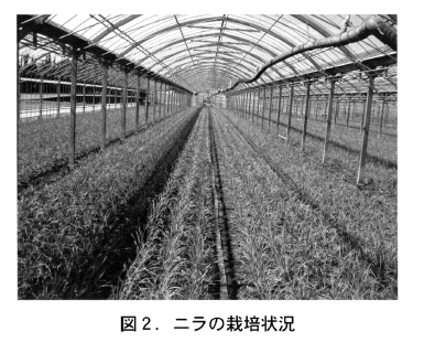 栽培の特徴は,冬ニラでは,8月に施肥および苗の定植後,3ヶ月間の株養成期間にはビニルを被覆せず,この間,秋雨や台風によるまとまった降雨に遭遇し,刈捨て後にビニルを被覆し,11月から翌年6月頃までに8回の収穫を繰り返す。夏ニラでは,4月に施肥