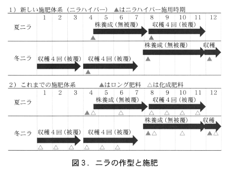 夏ニラからスタートしたニラハイパー肥料であるが,元肥の株養成に1回目施用(4月),株養成後収穫開始前に2回目施用(7月)ができる。さらに,冬ニラでも,株養成に1回目施用(8月),収穫開始前に2回目施用(11月),4回収穫後さらに4回収穫分を3回目施用(4月)と夏ニラで2回,冬ニラでは3回施用することができる。