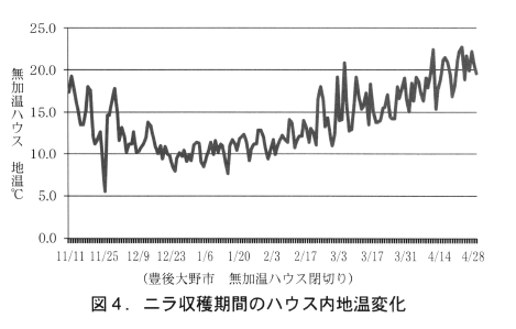 一方,栽培期間中の肥料の溶出に影響する地温の変化は(図4),夏ニラでは株養成期間は地温が次第に上昇し,収穫期間は次第に低下する。冬ニラでは,株養成期間は地温が高温から次第に低下し,収穫期間は無加温で締め込み状態では,露地と比較すると地温が確保されるが,12~3月の期間は10~15℃と低温で推移する。