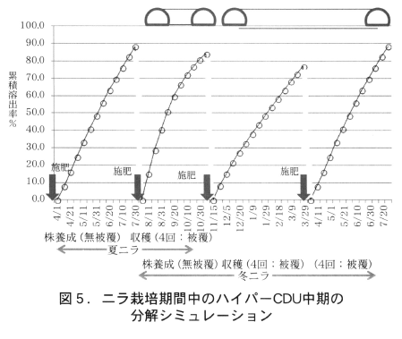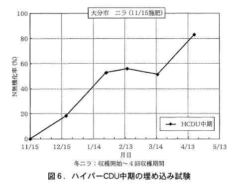 この低温条件において,ハイパーCDU中期タイプは,シミュレーションで示されているように(図5),年間の夏ニラ,冬ニラの全ての生育時期で生育期間で肥料の分解がほぼ終わる。さらに,冬ニラの株養成後の11月から3月までの低温期のハイパーCDU中期タイプの埋め込み試験結果(図6)はシミュレーション結果とほぼ一致し,期待に答えるものであった。