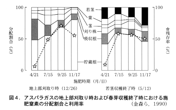 したがって,アスパラガスの春芽生産には秋期の光合成と晩秋の施肥窒素が主に寄与し,秋期以降も窒素肥効を切らさないように管理しなければならない。