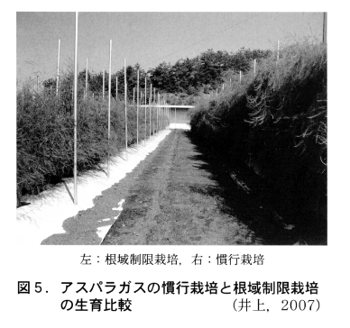 図5は長崎県総合農林試験場で,2007年6月上旬に128穴セル成型苗を定植した露地栽培の同2007年11月1日の生育状況である。生育量が小さい左側のうねは試験的に遮根シートを地下約15cmに埋設して根域を制限したもので,右側は一般的な慣行栽培である。定植後2か月は生育の違いがはっきりしなかったが,8月以降は明確に差が現われた。収量でも根域制限栽培ではL級以上の茎がほとんど萌芽せず,本数も慣行栽培に及ばず貯蔵根量も慣行栽培の半分以下となった。