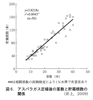 このことから,アスパラガスの貯蔵根量を増やすことが収量を上げるための絶対条件であるといえる。すなわち,定植前には必ず,根域を圃場全面かつ地中深く十分に確保できるよう,有機物施用と深耕あるいは硬盤破砕,耕うんをしなければならない。