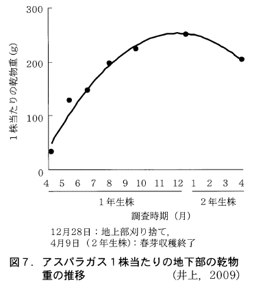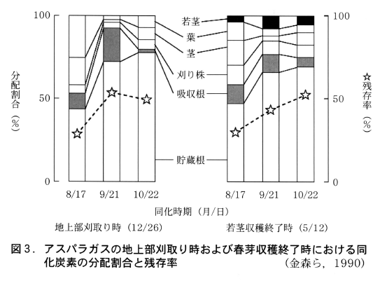 地下部の乾物重,無機養分含有量,糖質含有量はその生育ステージにより激しく変化し,越冬直前には収穫直後と比べて乾物重は約3割増,糖質含有量は約2倍となる。したがって,ソースである親茎茎葉の早期確保とその適正な維持,およびシンクである根の充実がアスパラガスの高い生産性とその維持に必要である。