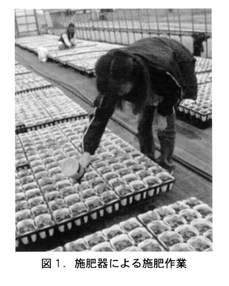一方,花壇苗生産においても,従来は用土に肥料を混和し定植後に化成肥料と液肥の追肥で管理していたが,平成18年に被覆肥料を鉢上げ後に用土表面に一発施肥する技術を確立し3),大幅な省力化となった。しかし,大規模な花壇苗生産農家は何十万鉢という鉢数を扱うことから,1鉢毎に施肥器で施肥する作業(図1)は負担が大きく,見落としも発生しやすかったため,さらに大量処理が可能な機械開発の要望が挙げられた。
