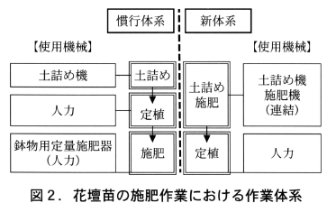 花壇苗生産における被覆肥料施肥技術は,鉢上げ時に①ポットへの土詰め, ②定植, ③施肥器による施肥,の順に作業を行う(以下,慣行体系,図2)。ポットへの土詰めは,コンベアで搬送されたポットトレイ上に用土を落とし入れる土詰め機が普及しており,多くの生産者が所有している。