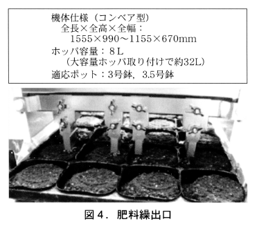 開発機は,施肥部とコンベア部から構成される(図3)。施肥部の肥料繰出口は4列で,繰出口が蝶ネジにより上下左右に可動することで,ポットの高さと幅に合わせ施肥位置を調整できる(図4)。コンベア部は長さ150cmで,4本のV字ベルトにより毎秒5.2cmでポットトレイを搬送する。施肥部手前のコンベア上に可動式ガイドを設置し,ポットトレイの幅に合わせて所定の位置に搬送できるようにした。施肥ホッパは8L容量で,増量ホッパの装着により最大32L充填できる。肥料繰出量の調整は,チェーンボックス内のスプロケットの交換およびダイヤル式の無段階目盛により,施肥ロールの回転速度を制御して,約1~3g/鉢まで設定できる。また開発機は,土詰め機の外部接続端子に開発機の電源を接続し開発機のコンベア最後部に土詰め機のストッパーを取り付けることにより土詰め機と同調した動作が可能となる。