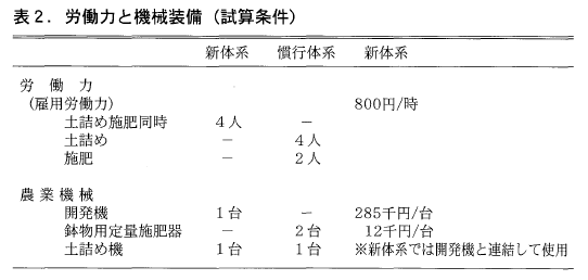 開発機の経済的導入効果を明らかにするため,生産費用で差が生じる費目(農業機械の減価償却費と修繕費,小農具費)及び労働費について比較検討を行った。農業機械の減価償却費は償却期間7年とし,1年当たりの修繕費は購入価格の3%とした。慣行体系で用いる施肥器は2台使用することとした。耐周年数は3年とし,この1年相当分を小農具費として計上した。また,労働費は両体系ともに,雇用労力で作業することを前提として時給800円とし,作業時間は3)の結果を用いることとした(表2)。