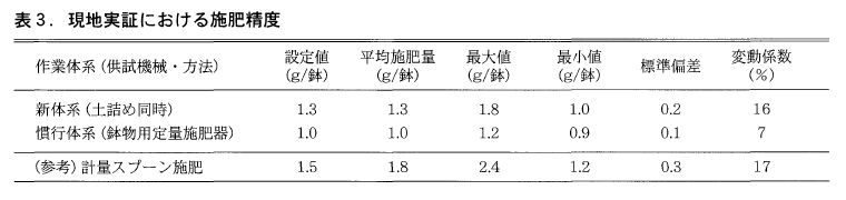 平均施肥量は,新体系慣行体系ともに設定値どおりとなった。1鉢ごとの施肥量の変動係数は,新体系で16%,慣行体系は7%であった(表3)。