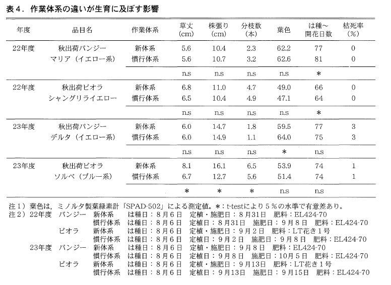 苗の草姿(草丈株張り,分枝数)では,平成23年のビオラで新体系が慣行体系に比べやや大きくなった。他は新体系と慣行体系でほぼ同ーの結果となった。は種~開花日数では,平成23年はビオラ,パンジーともにほぼ同ーの結果が見られたが,平成22年のビオラは新体系の開花が遅く,パンジーは新体系で開花が早かった。枯死率はすべて5%未満であった(表4)。