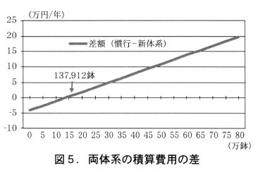 生産量と両体系の積算費用の差(慣行体系費用-新体系費用)の関係をみると137,911鉢までは慣行体系の方が生産費用は安いが,137,912鉢で差が無くなり,これ以上の生産鉢数では新体系の生産費用の方が慣行体系より安く有利となった(図5)。