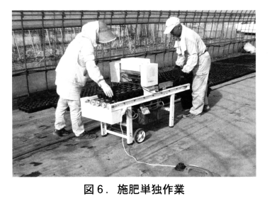農家既存の土詰め機と組み合わせて利用し,同調して動作することで肥料ロスが少なく効率よく作業ができる。さらにコンベア一体型としたことで,施肥単独作業も可能である(図6)。