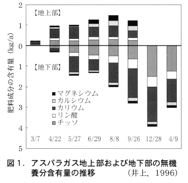 アスパラガスの養分吸収の大部分は,立茎開始直後から地上部茎葉を形成する短期間のうちに急速に行なわれることから,この肥料の利用率が高い立茎時に重点を置いた施肥法が有効であると考えられる。その後は夏秋芽収穫および、更新茎葉に必要な肥効を維持すべきである。