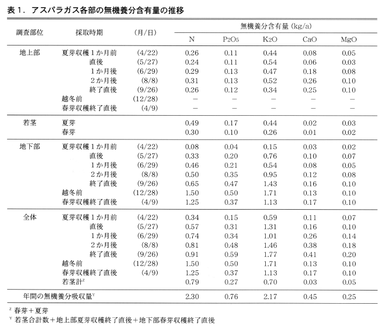 以上のことから,反収2tのアスパラガスの半促成長期どり栽培における年間の無機養分吸収量(表1の若茎+全体越冬前)は10a当たり窒素23kg,リン酸8kg,カリウム22kg程度と推察される。