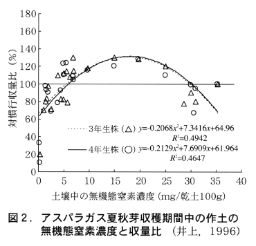 さらにアスパラガスの施肥管理のとらえ方として,夏秋芽収穫量の安定生産ボーダーラインを100(慣行栽培に基づく収量)とした場合の対慣行収量比を図2に示した。これによると,安定生産のためには,夏秋芽収穫期間中の作土の無機態窒素濃度は,10~25mg/100g乾土を指標として管理するのが望ましいと考えられる。