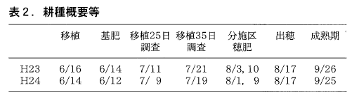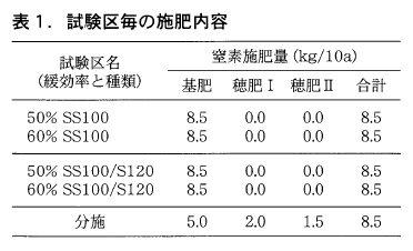 試験は平成23年と24年の2ヶ年,福岡県農業総合試験場内の灰色低地土水田圃場にて6月中旬植で実施した。詳細な試験区は表1に示す。S120を併用する試験区については玄米タンパク含量の上昇を回避するため,予備調査に基づきSS100とS120を窒素ベースで7:3の割合で配合して用いた。移植日や施肥日等の耕種概要については表2に示す。