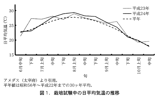 本県における6月中下旬移植の水稲普通期栽培においてLPコートを使用する場合,7月の気温がどのように経過するかで溶出の早晩が左右されやすい。この点に留意して試験を実施した2ヶ年それぞれの水稲栽培期間中の気象概況について比較したところ次の通りであった。平成23年は九州北部の梅雨明けが7月上旬(7月8日頃)と平年より10日以上早く,生育前半特に7月中旬までの暑さが顕著であった。これに対して,平成24年の梅雨明けは7月下旬(7月23日頃)で平年よりも4日ほど遅く,7月までは高温傾向ではなかったが,8月は平年を上回る暑さであった(図1)。