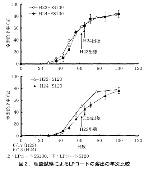LPコートの溶出については栽培試験に用いたSS100とS120について試験圃場に埋設して調査した。溶出タイプ毎で比較すると溶出の年次間差の違いが認められた。すなわち,SS100では,平成23年と24年とでは非常に類似した溶出パターンを示したものの,S120では梅雨明けが遅かった平成24年の方が23年よりも溶出の立ち上がりが遅く,出穂後,成熟期にかけても約40%分の溶出を示した(図2)。