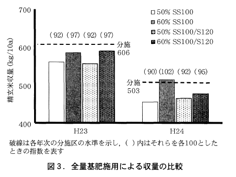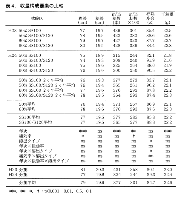 溶出タイプ毎に比較すると収量,品質ともに2ヶ年通して影響は認められなかったが,玄米タンパク質含量については,2ヶ年のうち相対的に溶出が緩慢であった平成24年に緩効率60%でのS120使用で,6.7%と他と比べてタンパク含量の上昇が認められた。