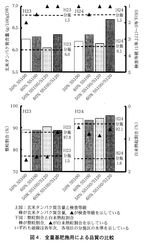また,この「元気つくし」において,検査等級や整粒割合では分施と遜色がなく,単純に基肥一発肥料の使用の要因のみで外観品質が悪くなるということは考えられない(図4)。