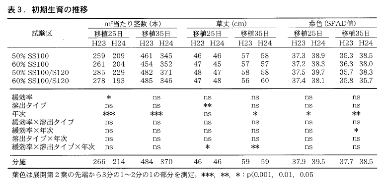 緩効率毎で比較すると50%と比べて60%では速効性窒素がわずかに少なくなるもののその差はわずかなため移植25日および35日の生育差は認められないが,㎡当たり籾数の増加のため,収量が増加傾向にあった(表3,表4,図3)。