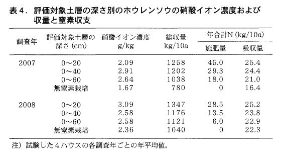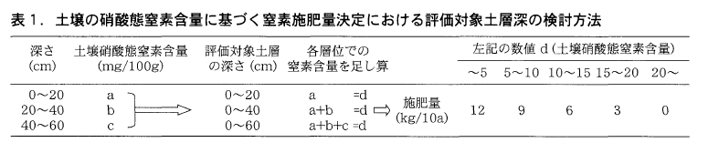 下層まで土壌中の硝酸態窒素を評価した場合の年合計窒素施肥量を従来法と比較すると,深さ0~40cmを評価した場合で15~16kg/10a,0~60cmで23~27kg/10aの減肥になった。深さ0~40cmまで評価したときの窒素施肥量はホウレンソウによる吸収量と概ね同程度かあるいは下回った。
