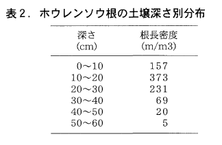 根系は深さ40~50cmに達しており,主要な根群は深さ10~30cmに存在した(表2)。ホウレンソウの原産地は中央あるいは西アジアの乾燥地帯と考えられており,根系は播種後70日で深さ1.2mに達するとされる。北海道におけるホウレンソウの平均的な栽培日数は35日程度であるが,収穫時点で根系が作土層より下に伸長していることは明らかである。