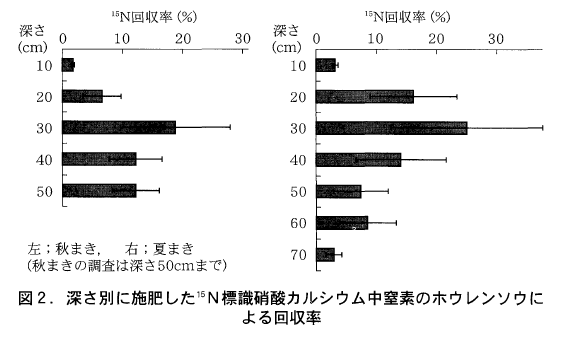 ホウレンソウの収穫時の根系を滝川市のハウス(灰色台地土)において深さ別の根の本数より調査し,根長密度を算出した。また,土壌の深さ別の硝酸態窒素の吸収パターンを調査するため,発芽始期に株間に穴を開けて,深さ10cm刻みで埋設位置を変えて15N標識硝酸カルシウムとして硝酸態窒素を5kg/10aずつ施用し,秋まきと夏まきの作型でホウレンソウを栽培した。