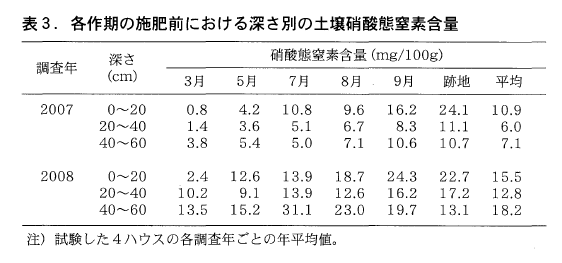 窒素診断の対象土層を検討するため,各年における施肥前の土壌中の硝酸態窒素を深さ別に見ると(表3),1作目の作土ではほとんどのハウスで1~3mg/100g程度であったが,深さ20~40cmには10mg/100g以上あるハウスも見られ,2作目以降には各層位とも作期が進むと徐々に高まった。