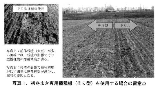 播種機については,ドリルシーダは一般的に土壌水分が高いと使用できないが,砕土性や前作の残渣をあまり気にせずに播種できることから,播種床造成法を選ばない優位点がある。一方,そり型は多水分条件でも播種が可能であるが,圃場に前作の残渣が多く残る場合には播種精度が劣るので,残渣処理を徹底する事に留意する必要がある(写真1)。