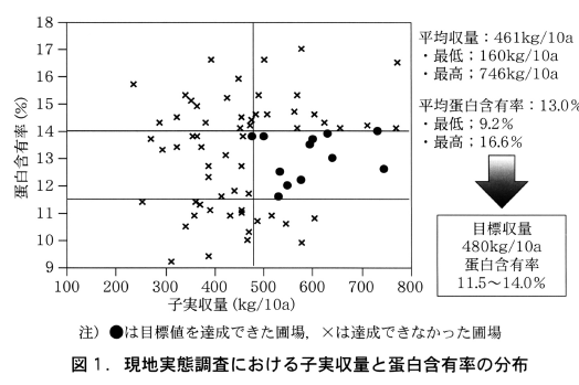 しかし,調査対象地区内はほぼ同ーの気象条件でありながら,子実収量や蛋白含有率の変動幅が広く,低収や低蛋白な圃場も多い実態が示された。これは,地域内での土壌・施肥管理基準が統一されておらず,地力に応じた適正な窒素施肥がなされていないことが最も大きな原因と考えられた。そこで当面の子実収量目標値を480kg/10a,蛋白含有率の目標値をランク区分基準内(11.5~14.0%)への平準化,また,この場合の窒素吸収量が14kg/10aであったことから,これらを指標として適正な土壌・施肥管理基準の設定に取り組んだ。