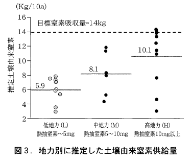 次に,施肥管理の実態を把握するために土壌の窒素地力(熱水抽出性窒素含量:熱抽窒素と略)および、窒素施肥量の実態を調査したところ,地力の高低を考慮せずに施肥されている実態が明らかとなった。基本的な土壌環境が良好な圃場では,子実収量や窒素吸収量は土壌の窒素地力と密接な関係があることから,地力レベルを低(L),中(M) ,高(H)の3段階に区分(それぞれ熱抽窒素5mg/100g未満, 5~10mg/100g,10mg/100g以上に相当する)して,各調査圃場において土壌から供給される窒素量を推定し図3に示した。低地力圃場では土壌から供給される窒素量は5.9kg/10a,また,中,高地力圃場ではそれぞれ8.1,10 .5kg/10aと推定されることから,目標窒素吸収量である14kg/10aに不足する量を窒素施肥で供給する必要がある。これら地力別土壌窒素供給量から窒素施肥必要量を求めると,それぞれ地力区分低(L):15kg/10a,中(M):12kg/10a,高(H):7kg/10aと算出(施肥窒素の利用率を50%と仮定した)されることから, これらを地力区分に応じた窒素施肥基準量とした。