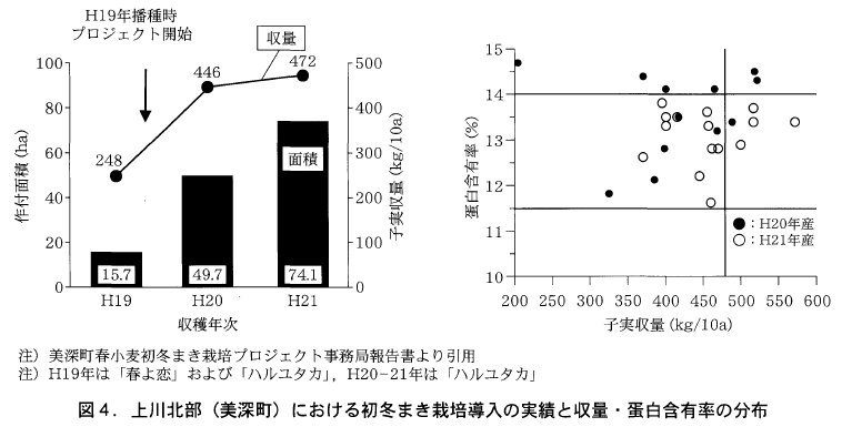 現地における子実収量と蛋白含有率の実態を把握するための調査を実施し,図1に実証圃場(平成19~20年 のべ49圃場)における子実収量(粗麦,以下同様)および蛋白含有率の分布を示した。2カ年の平均は子実収量461kg/10a,蛋白含有率13.0%と,上川地域全体の統計収量に比較して良好な結果であった。これは,当調査地区が平成18年度地域支援会議プロジェクトチーム(JA,普及センター,農試)対象地区として,栽培技術の講習・普及や播種機共同利用組合の設立を前提として初冬まき栽培の導入が図られたモデル地区であり,熟練オペレーターによる適期播種や,基本栽培体系講習会等の開催が重点的に実施された成果と考えられる。