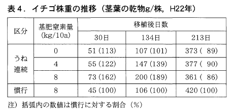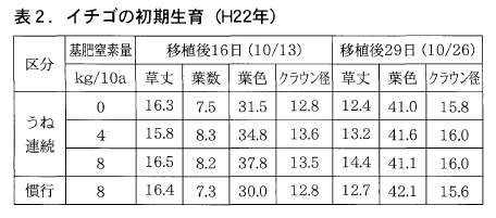 うね連続栽培区において基肥窒素量が慣行施肥量の8kg/10aの場合,慣行区と比較してイチゴの初期生育が向上する結果が得られました(表2)。