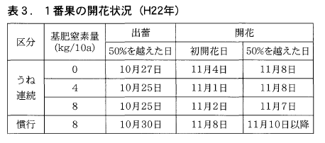 1番果の開花は,基肥窒素量が慣行施肥量の8kg/10aの場合,うね連続栽培区が慣行区より初開花が6日早まり,開花率が50%を超えた日も4日以上早まりました(表3)。