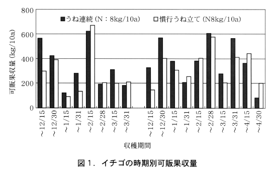 基肥窒素量が8kg/10aの場合,うね連続栽培区では慣行区に比べて12月までの果実収量が4~5割の増収となり,1月以降の収量も増加し,収穫期間全体を通しでも1~2割の増収となりました。うね連続栽培区の1番果では果実の肥大が進み,果形がやや乱れて秀品率は低下しましたが,全体の収量が増加したため秀品収量は慣行区と同等以上の結果となりました。うね連続栽培区の基肥窒素量の違いによる比較では,窒素無施用でも慣行うね立て栽培と同等以上の収量が確保されましたが,窒素量が多いほど収量は多くなり,局所施肥でも減肥しない方が増収効果が高い結果となりました(表5,図1)。